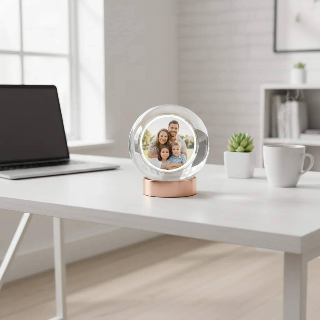 The Memory Orb is a revolutionary way to display your digital photos and videos in a stunning crystal sphere. It's a modern, portable, and deeply personal alternative to traditional frames, making your memories truly come alive.